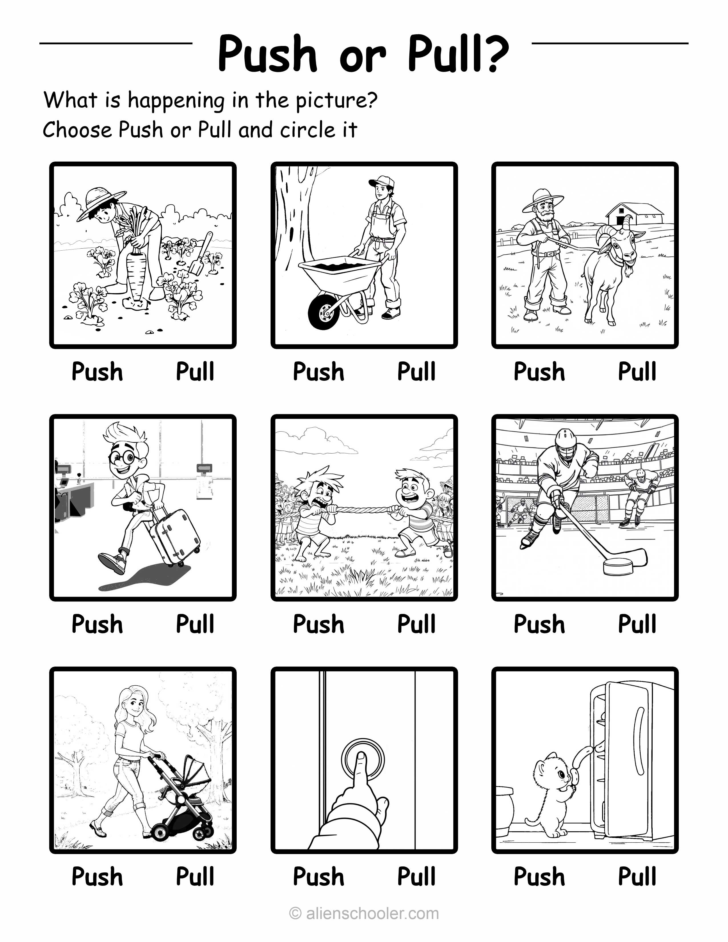 This fun and engaging science worksheet helps kindergarten students practice identifying pushes and pulls through simple picture-based questions.